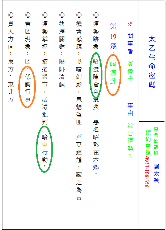 ◎某年夏天, 黃博士(某企業副總)來問事。