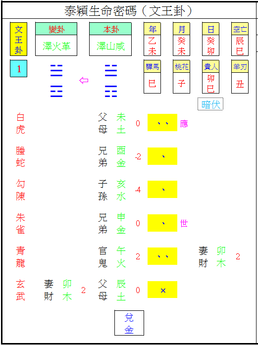□卦得『澤山咸』之『澤火革』,一爻發動: