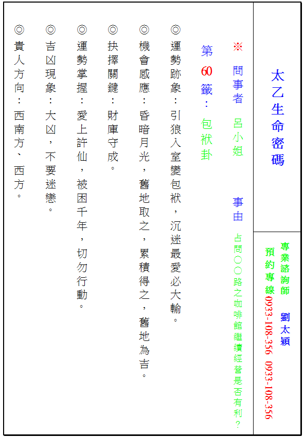 ◎曾小姐占問:『○○路之咖啡館繼續經營是否會好轉?』
