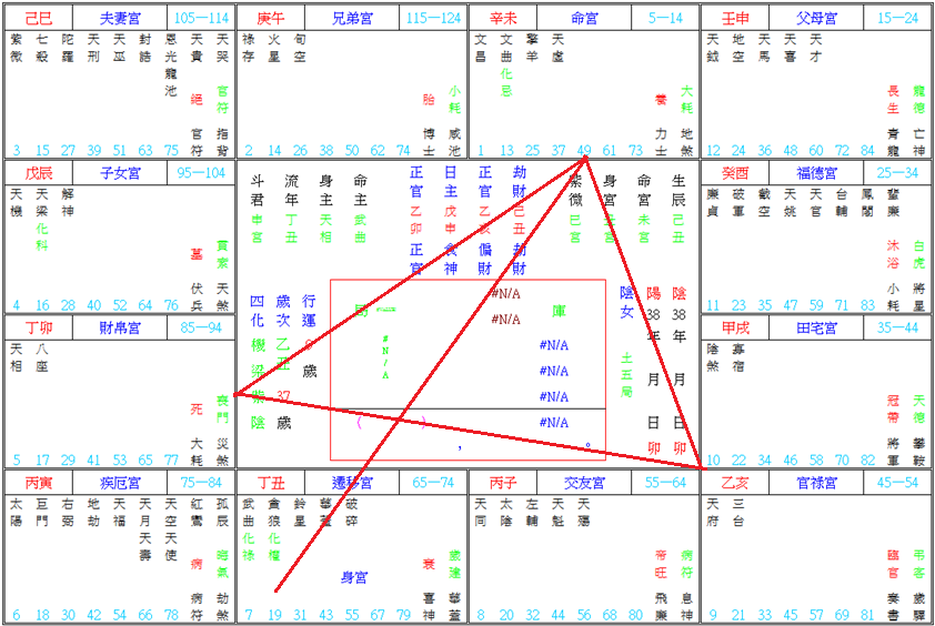◇甲戌大限夫官空劫對照逢破,且大限為巨日加祿忌,主一明一暗,田宅亦是權祿交加,故該大限其夫夜不歸營之機率增高。